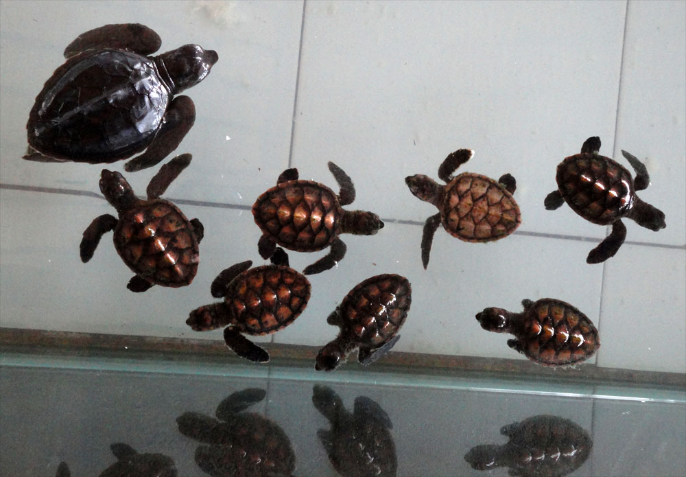 Kami berhenti di sebuah tempat yang terkenal sebagai Turle Conservation. Awalnya konservasi ini dirintis tahun 2006. Pak Marjan, nama pengelolanya. Di bawah plang “Turtle Conservation” terdapat gambar Garuda Indonesia. Kabarnya, memang konservasi ini dibangun dengan dana bantuan dari Garuda, akan tetapi untuk pengelolaan sehari-hari masih diupayakaan secara swadaya dengan meletakkan kotak sumbangan di dekat bak konservasi.