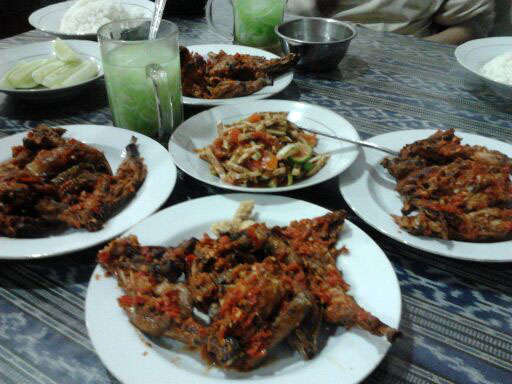 Malam itu kami mencoba menu ayam taliwang di Rumah Makan Taliwang Jalan A.A. Gde Ngurah 26 Cakranegara, dekat Gapura Pasar Cakra. Alasannya sih simple, Pak Bondan “Wisata Kuliner” pernah meliput rumah makan ini. (dan kata teman kuliah saya yang penduduk lokal, Rumah Makan ini yang tertua di Cakra). Jadi, sah ajah saya memaksa teman-teman makan di sini. Huehehe!