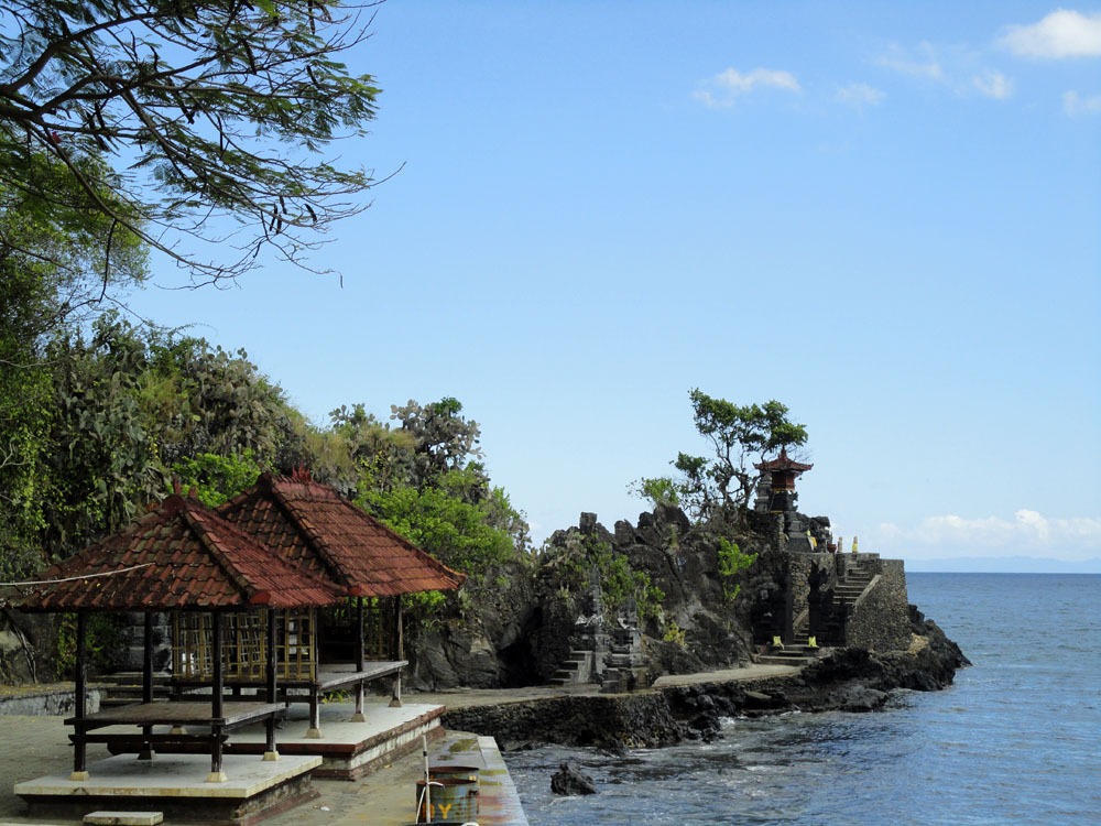 Ada dua pura yang menghiasi karang warna hitam ini. Berjalan menuruni anak tangga, kita akan menemukan pura pertama yang bersemayam di bawah naungan pepohonan rindang. Pura kedua berdiri di atas karang yang menjulang setinggi kurang lebih empat meter dan memiliki lubang di tubuhnya. Lubang inilah yang menjadi inspirasi lahirnya nama Pura Batu Bolong.