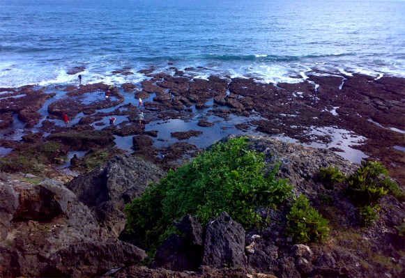 warga lokal sedang mencari kerang da rumput laut di sore hari