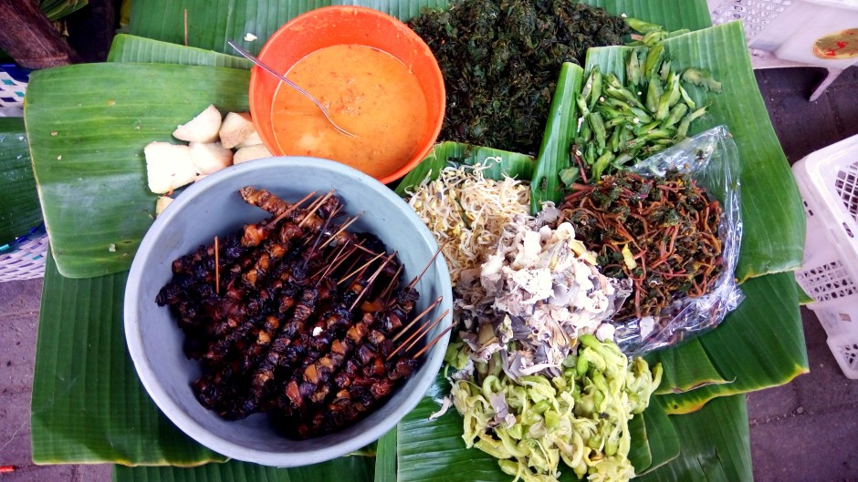 Bagian paling menarik adalah komposisi sayurannya: semanggi, kecipir, kembang turi, jantung pisang, krokot, kecambah, sate keong dan lontong. Kenapa lontong? kata teman saya, karena cara makannya lontong ditusuk dengan sate keongnya.