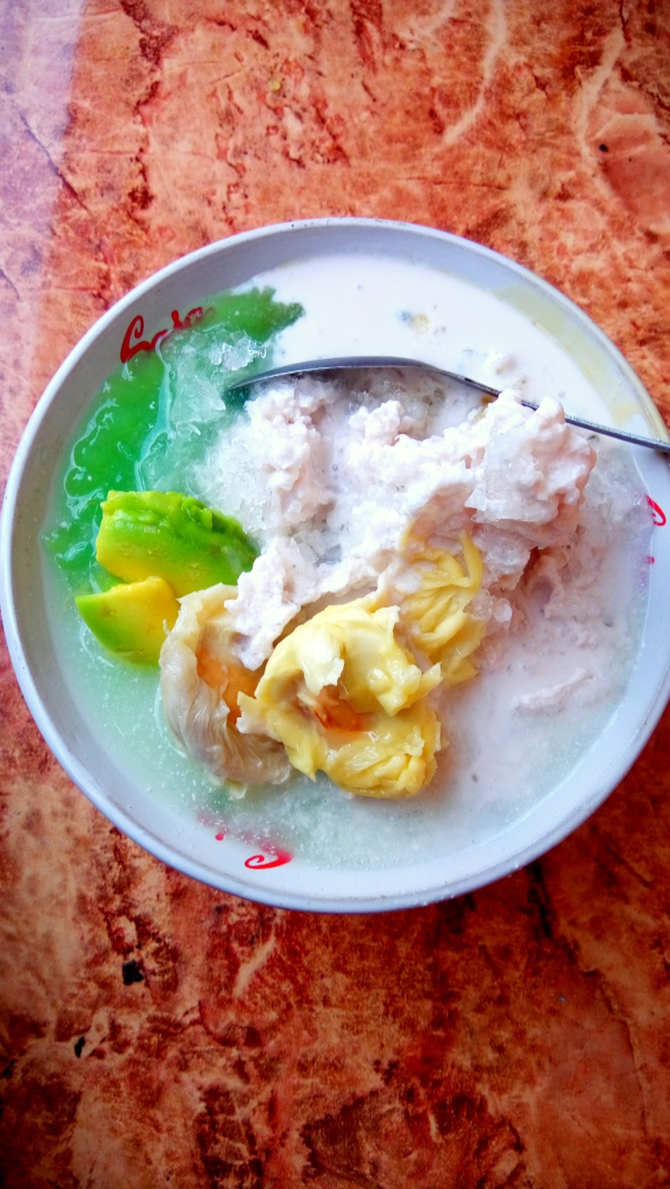 Es Dawet Duren berkomposisi Dawet, Duren, Tape Ketan Hijau, Alpukat, Es Serut, Santan dan Gula Jawa.