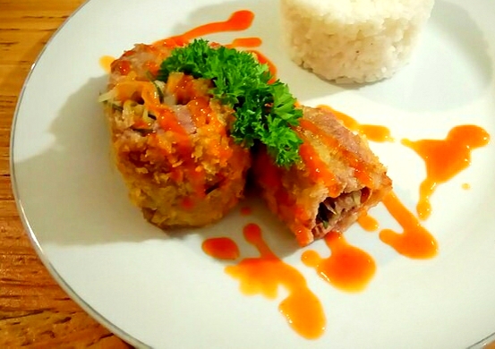 Didalam gulungan beef tsb berisi sayuran, yg saat digigit akan memberikan taste unik di mulut. Tingkat kematangan beef pas, rasa gurihnya berbaur dengan sayuran didalamnya.