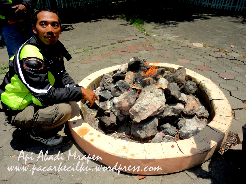 Dari Bledug Kuwu, kami menuju lokasi ke-6 yaitu Mrapen. Mrapen adalah lokasi petilasan Sunan Kalijaga. Letaknya ga seberapa jauh dari Bledug Kuwu, masih masuk Grobogan, yaitu di daerah Manggarmas, kecamatan Godong. Saya ingat sekali, siang pas kami mau menuju Api Abadi Mrapen. Kami juga melihat Balai Desa sedang kebakaran. Habis merata, tak ada yang terselamatkan.